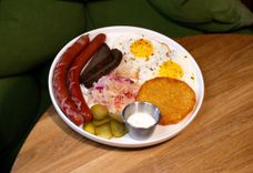 330/30 г • Драник картофельный, колбаски, глазунья из 2 яиц, квашеная капуста, огурец маринованный, сметана