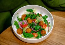 160 г • Свежий салат из хрустящей зелени, томата, маринованного лука и фалафеля