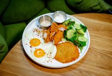 300/30/30 г • Сытный завтрак с глазуньей из двух яиц, картофельного драника, курочки в панировке, микса салатов, огурца, сметаны и орехового соуса