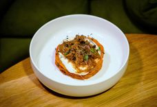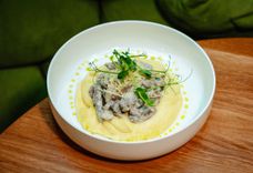 210 г • блюдо — отсылка к периоду жизни Марка Шагала в родном Витебске. Кстати, Шагал не раз подчеркивал, что любил простую еду. Хрустящий картофель, рванная говядина в соусе демиглас и сырный мусс. Сытное, мы бы даже сказали, деревенское блюдо, которое возможно не оставит вас равнодушным!