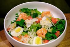 230/30 г • Омлет из трёх яиц, микс салатов, креветки, соус чили сладкий