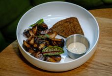 Шампиньоны карамелизованные в меду, ржаной хлеб, ореховый соус