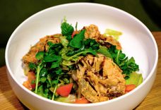 Тёплый салат с рваной говядиной, хрустящим баклажаном и томатами